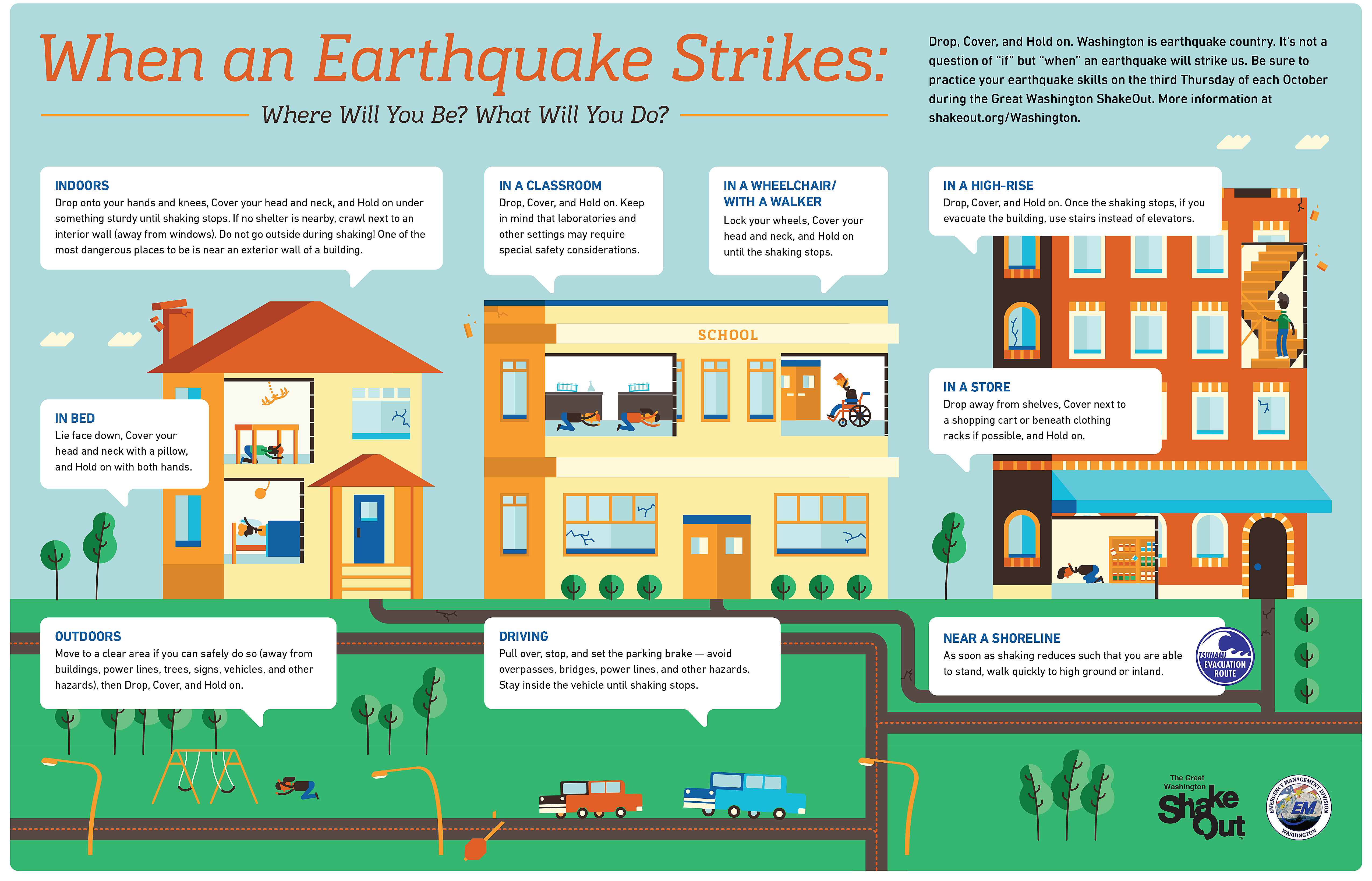 We also encourage participants to take photos of themselves participating in the drill and post those photos to social media using the hashtag #ShakeOut or tag our Twitter account at @waShakeOut.