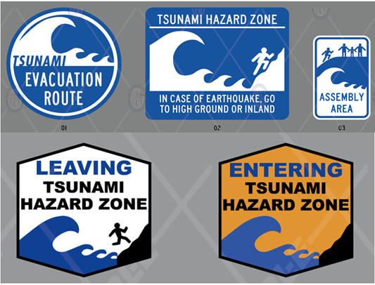 - Assembly Area Sign: A small, white rectangular sign with a group of people on top of a hill above a series of waves. The bottom of the sign has blue text that reads “Assembly Area”. These signs are used to identify tsunami assembly areas, central meeting points outside of the inundation zone where evacuees may gather following a tsunami.
