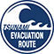 - Tsunami Evacuation Route: A round white and blue sign with a series of waves in the background and the words “Tsunami Evacuation Route” stretched across the bottom half of the sign. This sign indicates an official tsunami evacuation route that leads either to the closest high ground or inland out of the inundation zone.