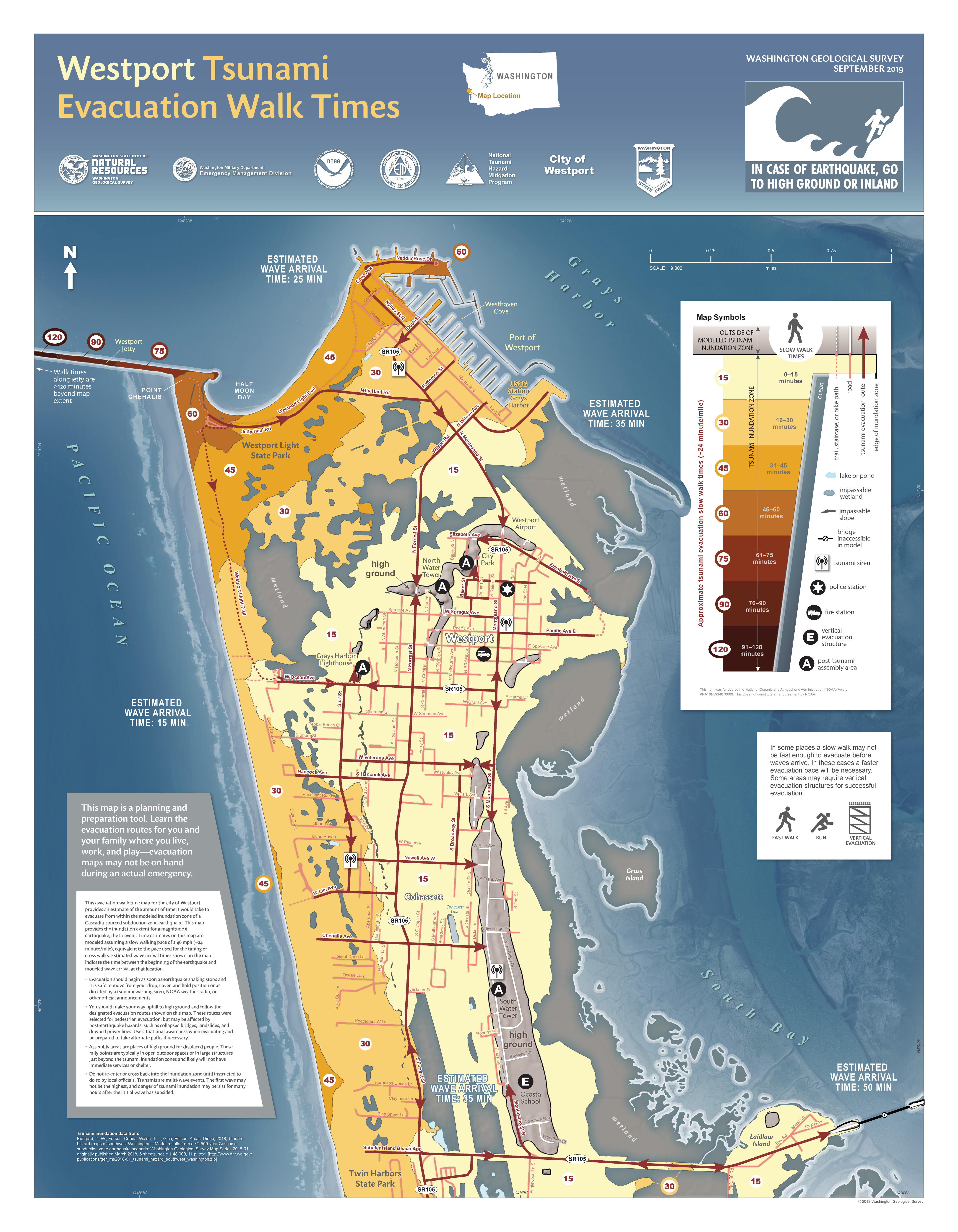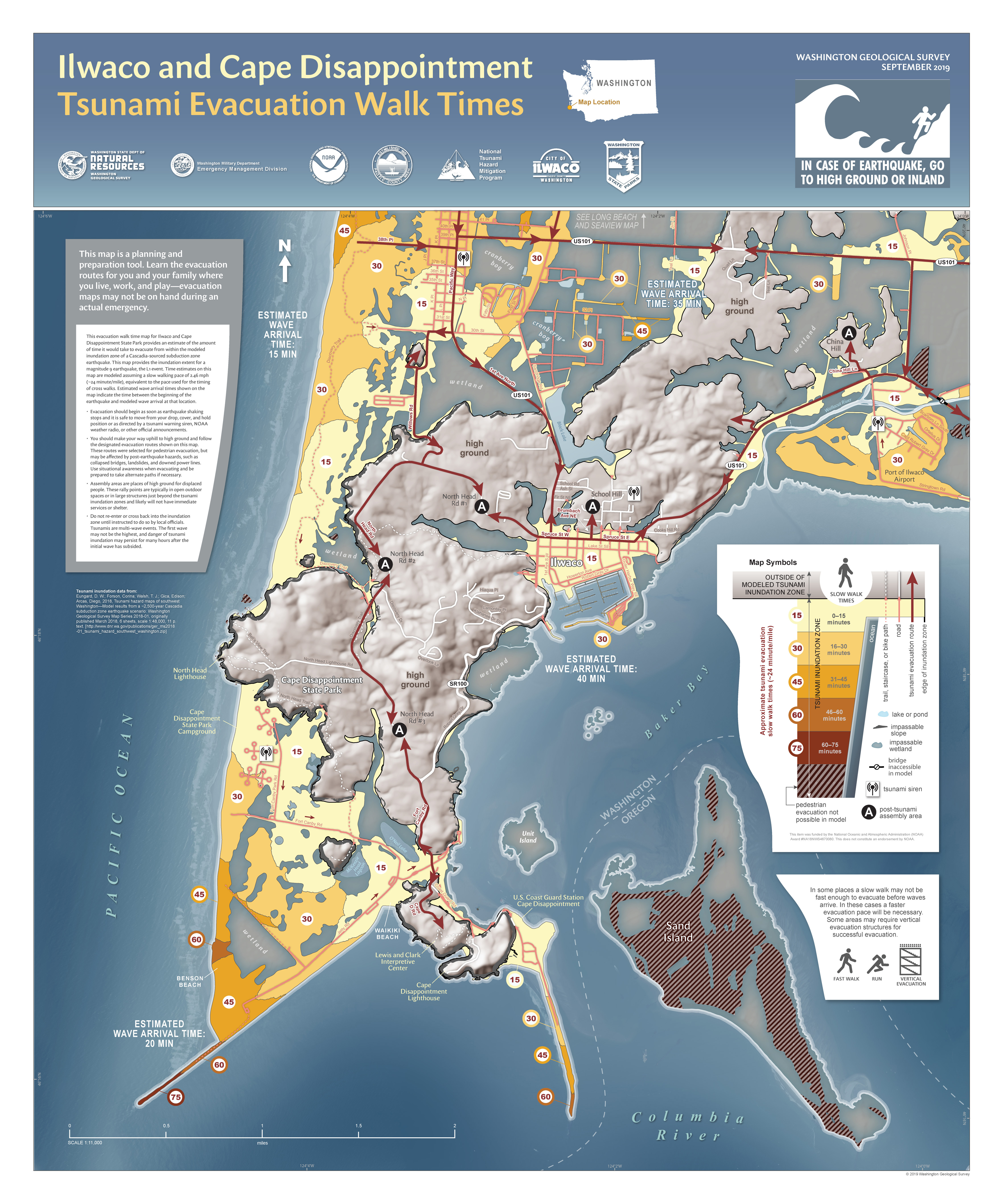 - Complete pedestrian evacuation maps: Tsunami evacuation maps assist coastal residents and visitors in finding high ground in case of a tsunami. Look for published evacuation maps on our website. Coordinate with Washington Emergency Management Division and the Washington Geological Survey to identify evacuation routes and design maps for your community.