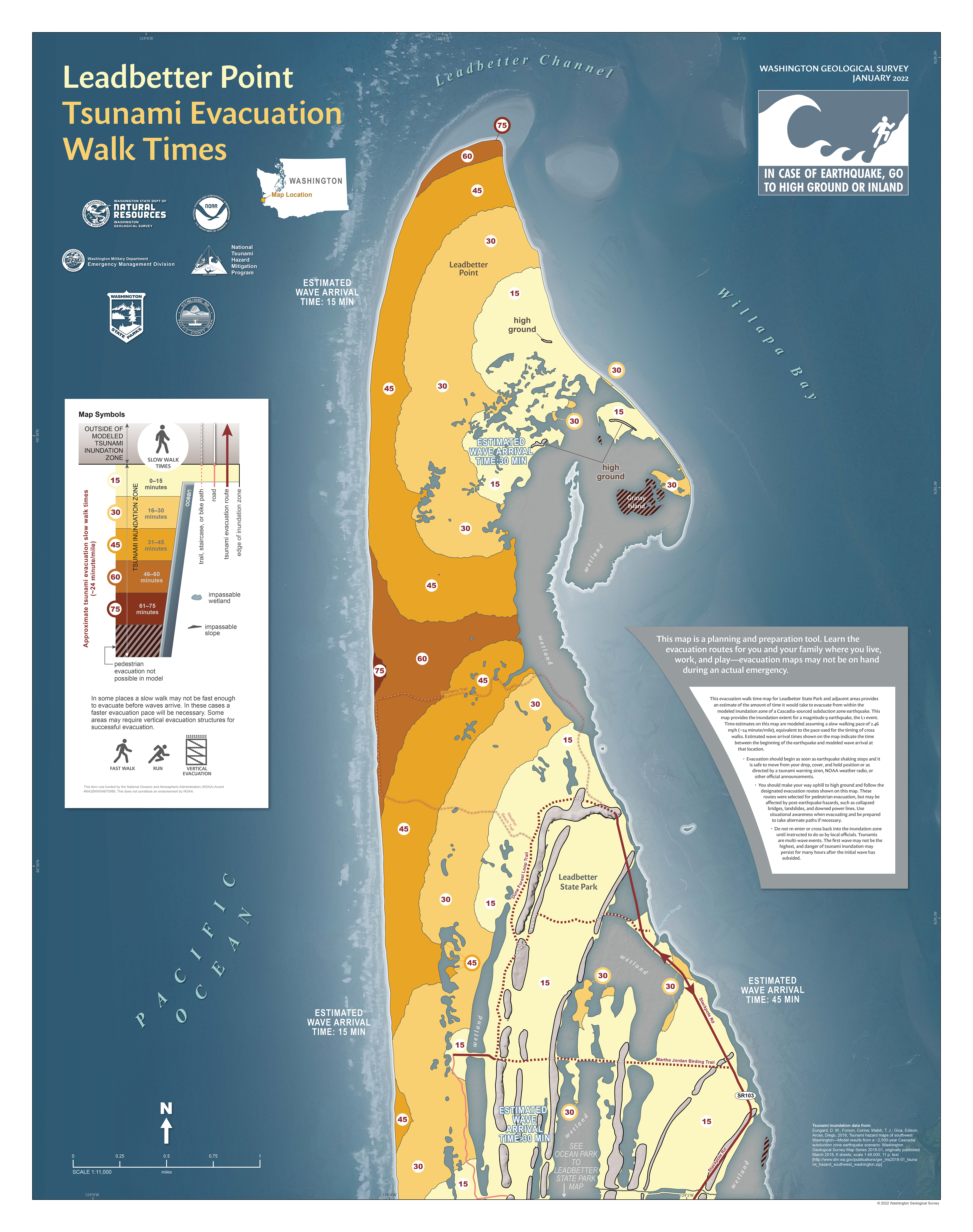 Tsunami evacuation walk time maps show a more detailed view of the time it would take to evacuate on foot from the tsunami inundation zone. The maps also show how long it is estimated to take for the first tsunami wave to arrive. You should use these maps to learn your routes ahead of time for home, work, and school.